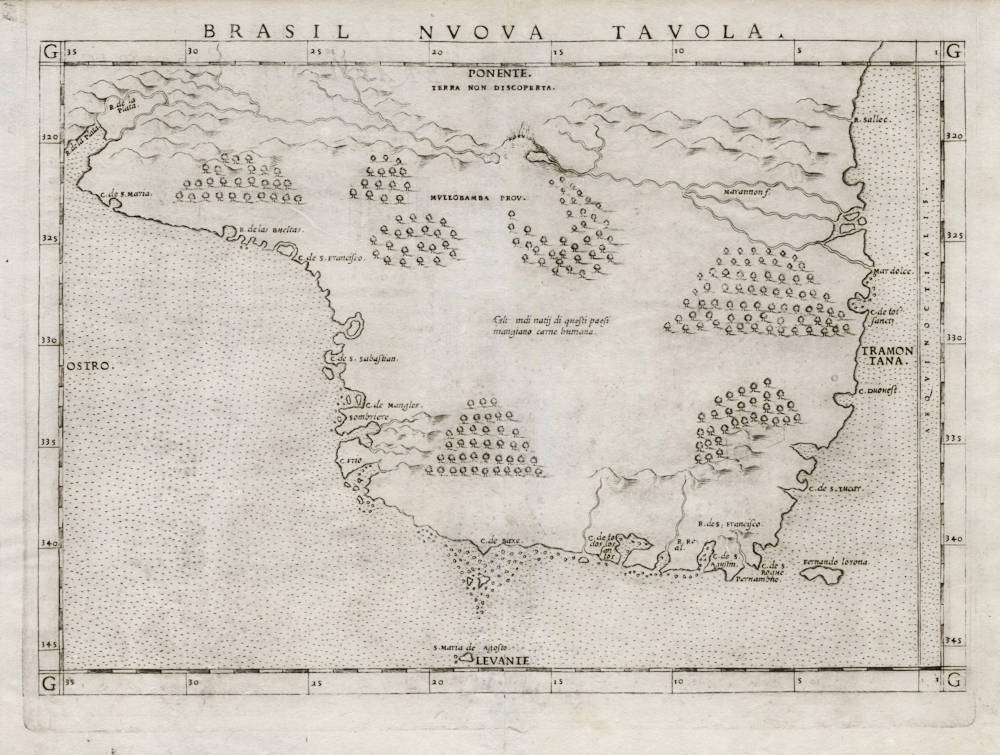 West is at the top as often with early maps of Brasil. In the upper left is de Rio de la Plata (River Plate), the Silver River. Some coastal placenames are given, but very little interior detail. An erupting volcano is shown in the Mullobamba Province, considered the source of the Amazon River, here named Marañón River. The river is so mighty, that it results in a sea of fresh water into the ocean (Mar dolce). Trees are depicted all over the map, to emphasize the lands are covered with dense forests and jungle. In the west it says "Terra non descoperta". A text refers to cannibalism: "Gli indi natij di questi paesi mangiano carne humana" (The Indians of these lands eat human meat).