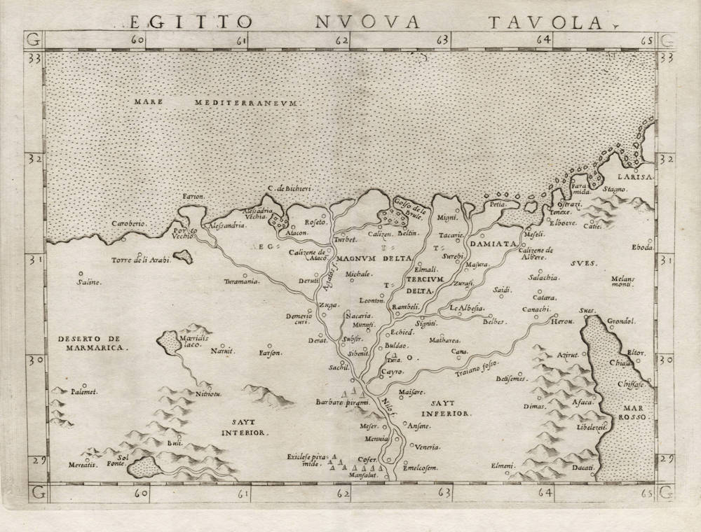 Ruscelli's enlarged version of the 1548 Gastaldi miniature map, which is the first modern map of Egypt. This is the second map of Egypt.