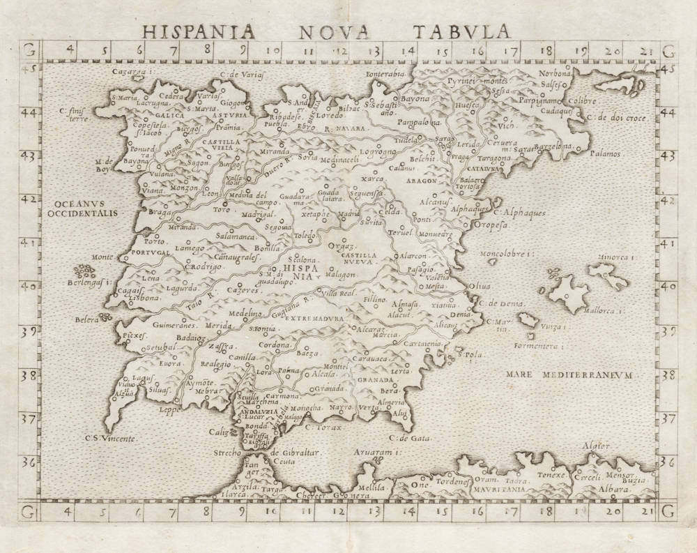 Ruscelli's enlarged version of the 1548 Gastaldi miniature map of Spain and Portugal. A landmark map for the Iberian peninsula.