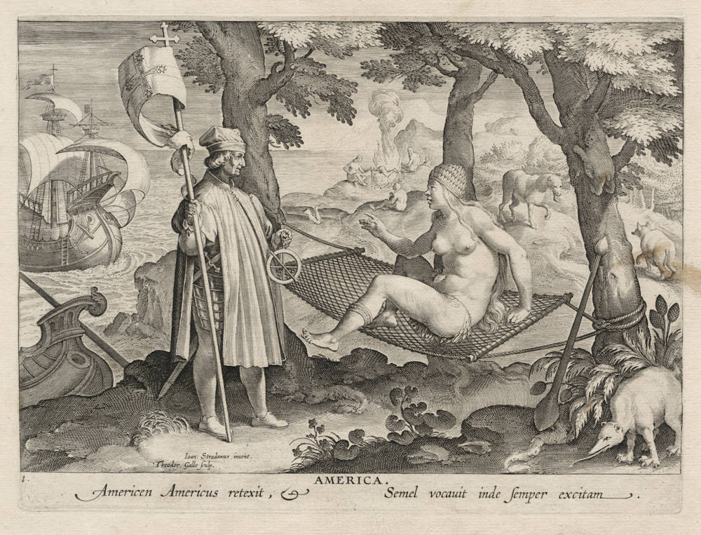 Legendary and iconic engraving by Theodor Galle after a drawing by Jan van der Straet (ca. 1575), showing Amerigo Vespucci discovering America.