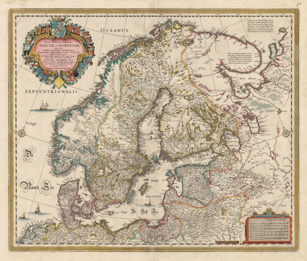 Nicolaes Visser's very decorative map of Scandinavia and the Baltic. The plate was engraved in 1630 by Abraham Goos, and first published in the 1630 atlas appendix by Jansson.