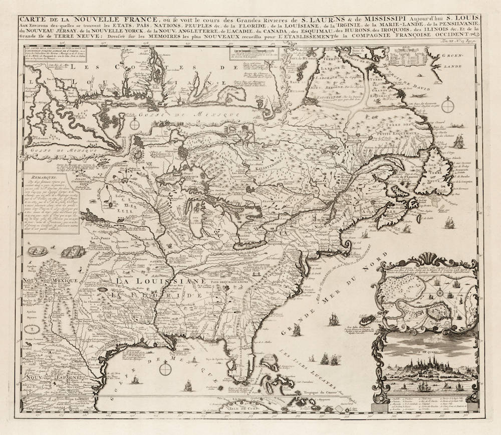 Derived from de Fer's landmark 1718 map in 4 sheets, from west of the Mississippi it contains a mass of inland detail with notes and vignettes of the indigenous peoples and fauna of North America. In an inset at top left the coast of Louisiana, in another inset at bottom right a panoramic view and plan of Quebec. Louisiana and the Mississippi valley are based on Delisle's manuscript map of 1701. The geography of New England and Eastern Canada originates with Franquelin.