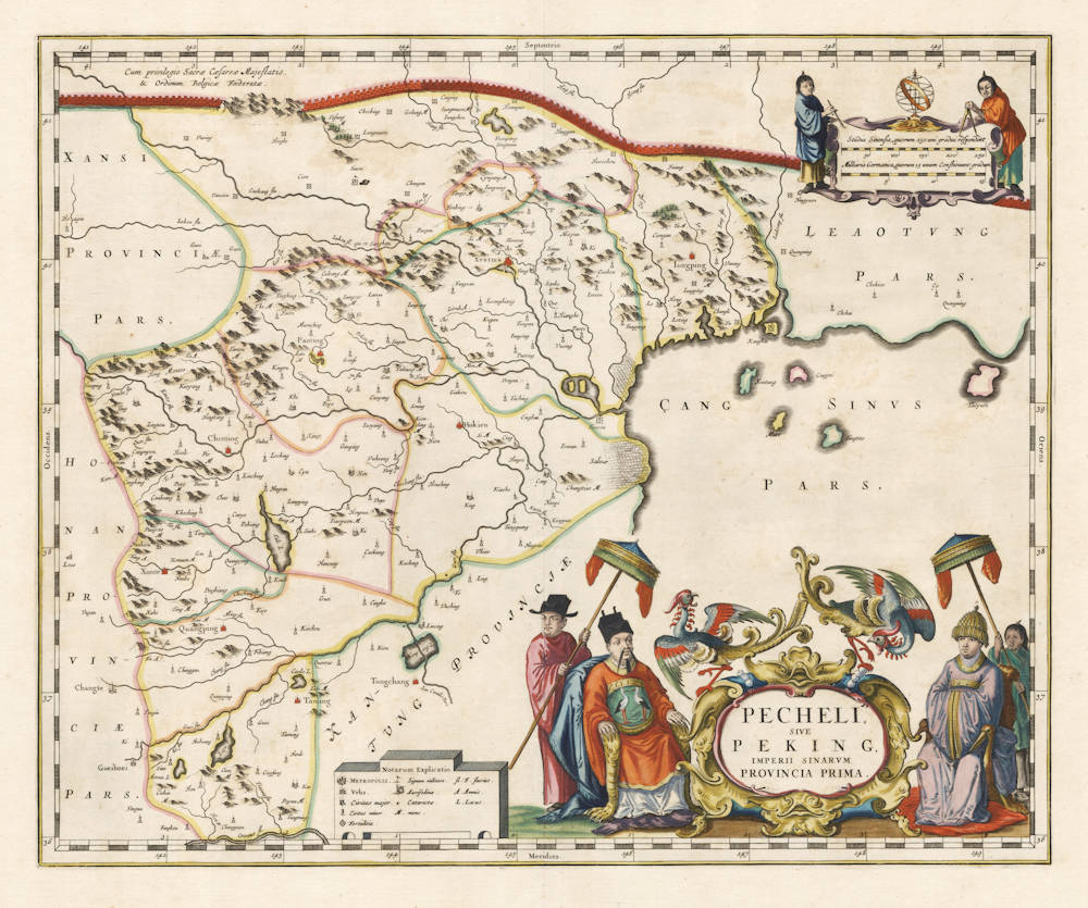 Joan Blaeu's beautiful map of the province of Hebei or Pei Chih-li, Beijing or Peking, engraved after a manuscript map by the Jesuit Martino Martini who traveled in China for seven years, and who visited Blaeu in Amsterdam in 1654 during a travel through Europe.