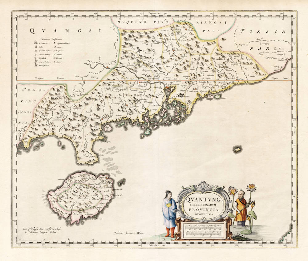 The best and most sought-after 17th century map of the area, centered on the Pearl River estuary with the port of Canton or Guangzhou and the Portuguese trading post of Macao. The island of Hainan is shown in great detail.