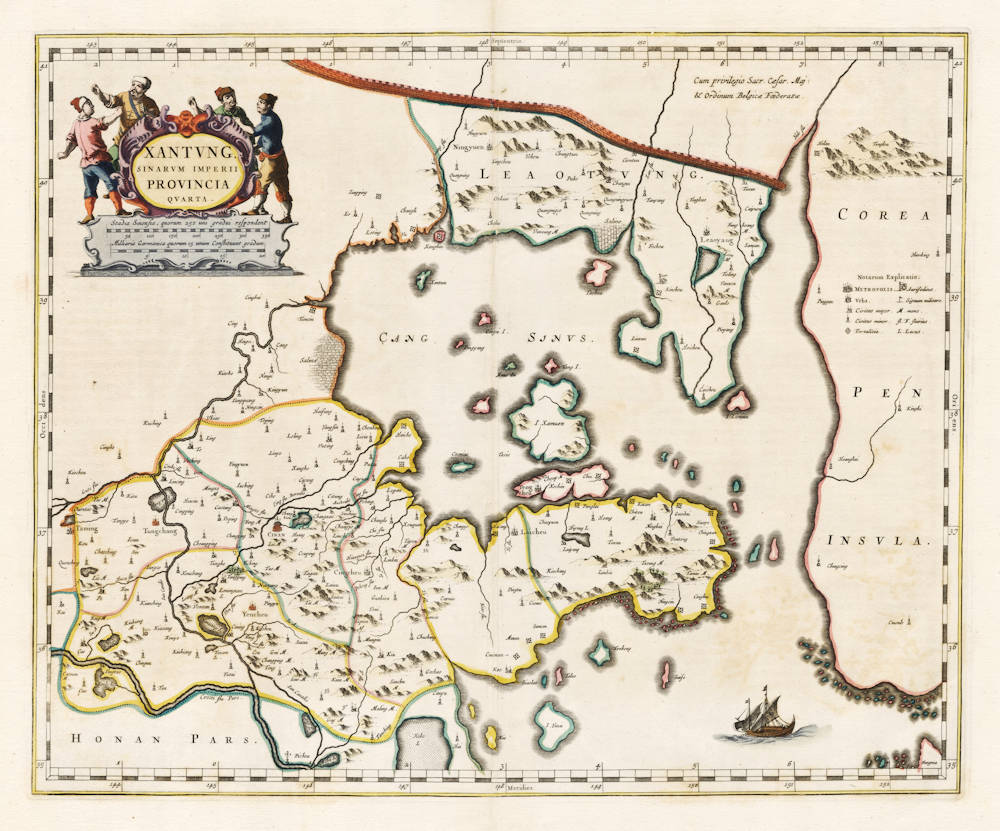 Blaeu's beautiful map of the coastal province of Shandong (Shan-tung), after the Jesuit Martino Martini who travelled in inland China for seven years.
