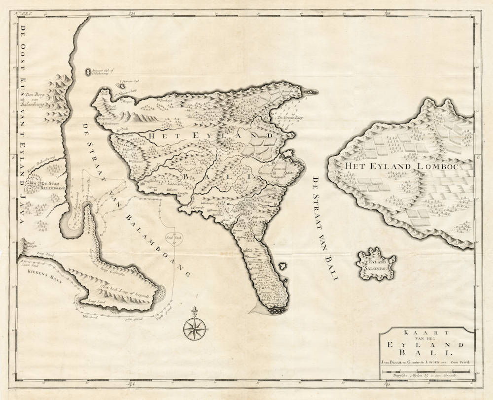 A superbly engraved and finely detailed large-scale chart of Bali from François Valentijn's Oud en Nieuw Oost Indien. It is the first and only large and detailed antique map of the island, elegantly engraved by Joannes van Braam.