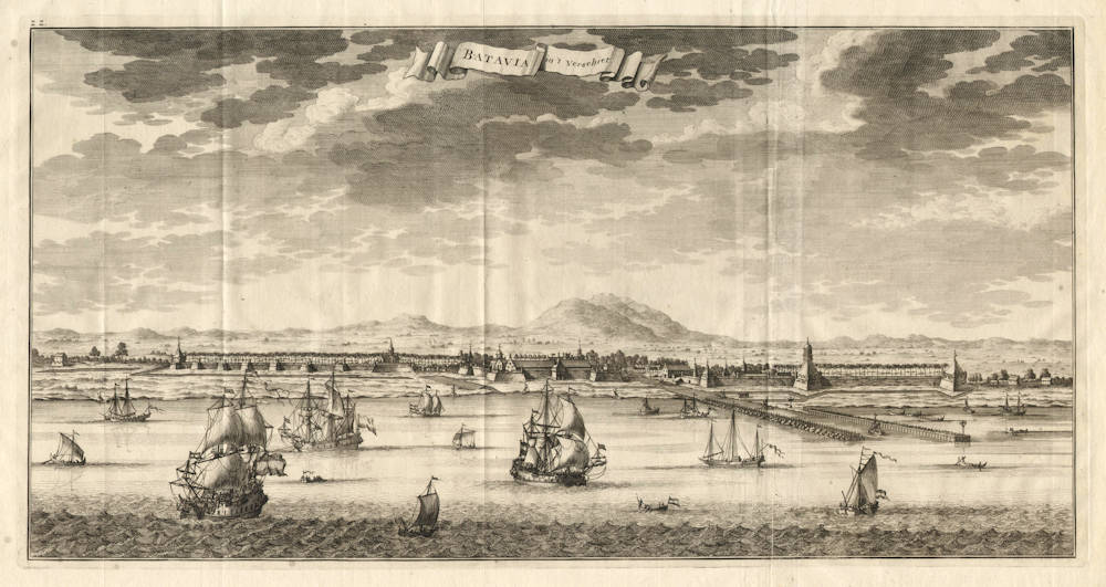 Attractive panorama view of Batavia, the pearl of the east. The bird eye's view shows the roadstead of the city, filled with VOC East Indiamen and Asian trading ships. The ship's reflections are mirrored in the water.