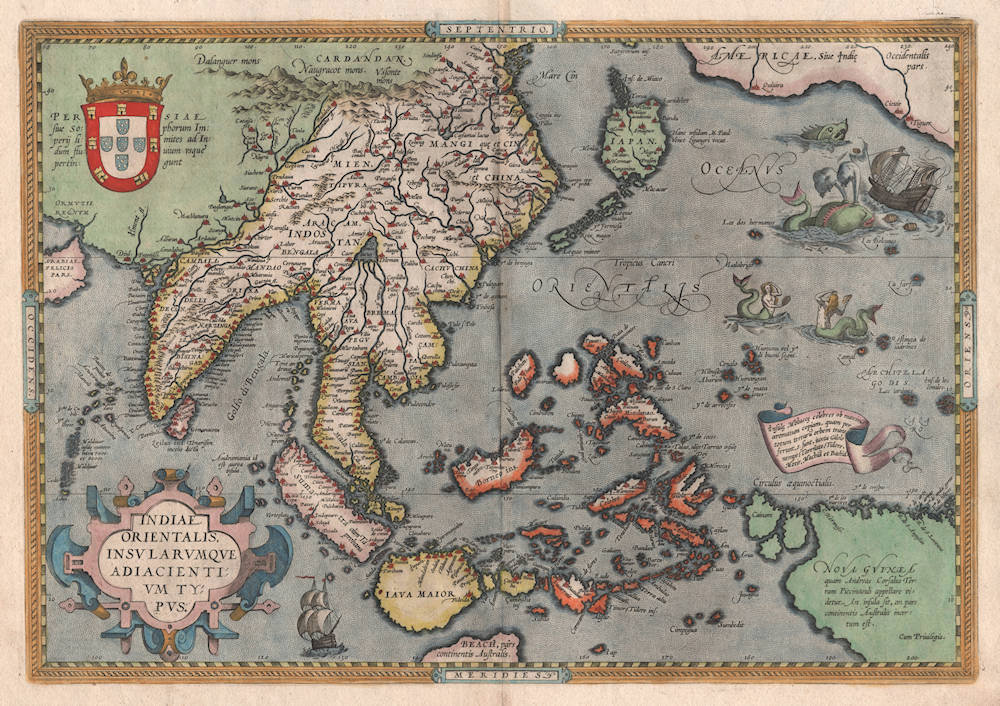 One of the most splendid maps of Ortelius, this map has everything that makes sixteenth century maps so attractive. Lovely mermaids, gruesome sea monsters and shipwrecks included. The cartography is distorted. Many elements of Marco Polo have been used, as well as the latest discoveries. Japan has the typical kite shape introduced by Mercator. The Portuguese coat of arms is shown prominently to underline that this is "Portuguese India".