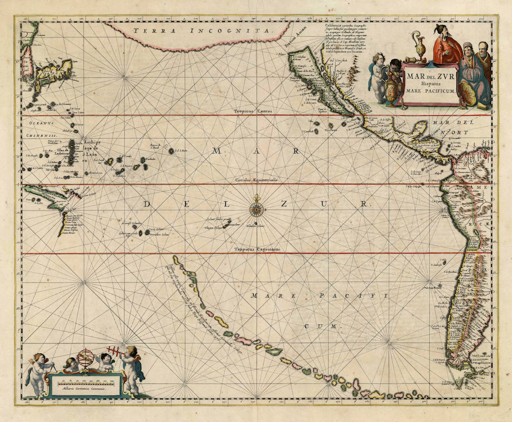 Jansson produced his first Atlas Novus in three volumes, in 1638. As a result of intense competition by other map publishers, notably by Blaeu, Jansson proceeded to expand on that atlas, adding new parts and volumes. In 1650, he introduced a sea atlas as part V of Atlas Novus, described by Koeman as the first sea atlas. It contained a number of finely executed charts, including this one of the Pacific.