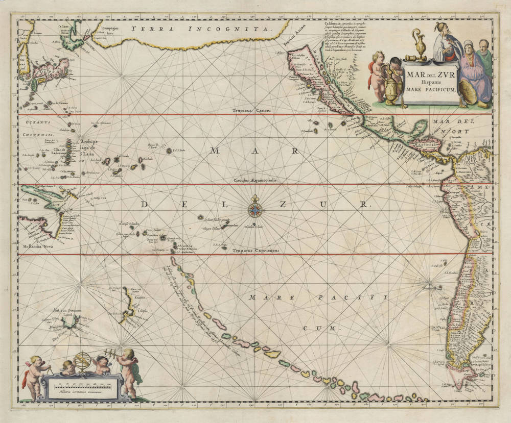 Exceptionally rare and important second state of this seminal sea chart of the Pacific. The map has been updated to include the discoveries of Abel Tasman's voyages of 1642-43 and 1644.