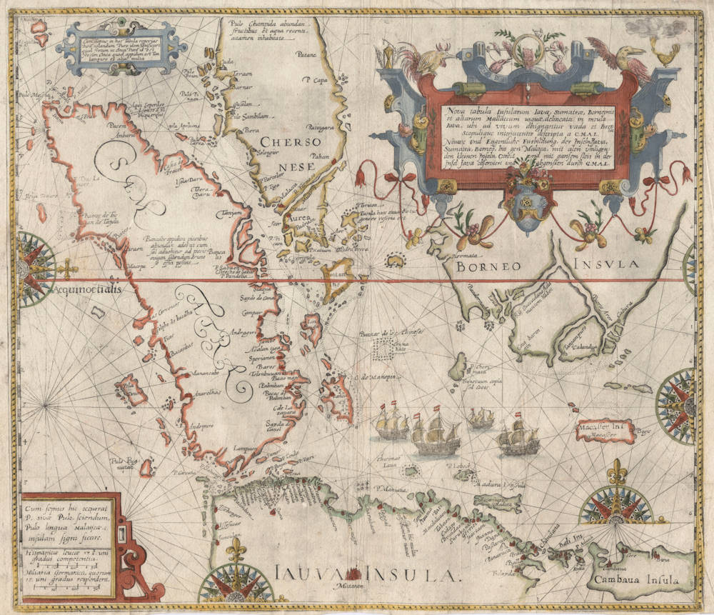 The maps shows the dangerous southern route to the Spice Islands via the Java Sea, which was threatened by Muslim States hostile to the Portuguese. European traders later chose a safer route north of Borneo through the Sulu Sea. In southern Borneo the Barito River Delta, in the vicinity of present-day Banjarmasin, is very confidently charted to a level of detail and accuracy far exceeding that shown on the maps of Ortelius and de Jode, but the Muar River in southern Malaysia is shown erroneously bisecting the peninsula, a typical feature of late sixteenth and early seventeenth century maps of the region. It is highly probable that the map was also published as a loose-leaf item at the turn of the century.