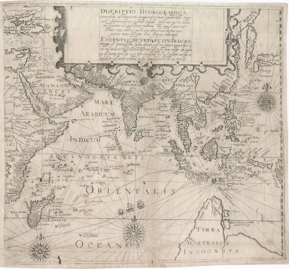 An overview of the route taken by this fleet was published by Cornelis Claesz in 1598 in Amsterdam, but all printed copies of this map were immediately confiscated by the Dutch Republic for reasons of secrecy. This "forbidden" map has survived in three examples only. Fortunately it was copied by Theodor de Bry.