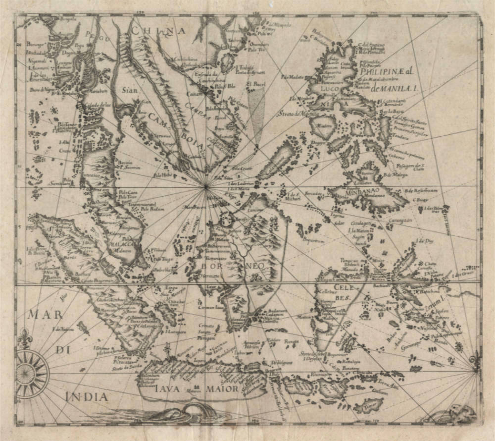 The third map by de Bry of South East Asia is an untitled one of the East Indies and the Philippines that was published in both the 1619 German and Latin editions of Part XI ('The Circumnavigations of William Cornelisz Schouten 1615-17 and Joris Van Spilbergen') of the Grands Voyages. The map has Mar Di India in the lower left corner of the map and copies appeared later in a number of seventeenth- and eighteenth-century travelogues with an inset of the island of Buton in the Celebes in the northeast corner of the map.