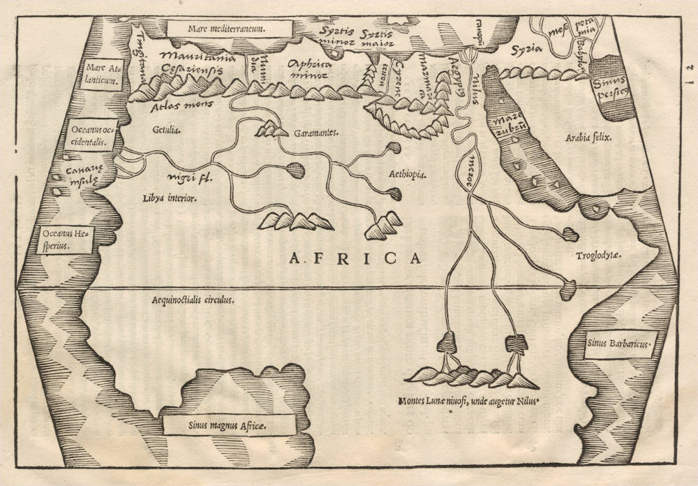 The geography is mostly Ptolemaic, with the Niger flowing west and the sources of the Nile located in the mountains of the moon. It uses Ptolemy's trapezoid projection.