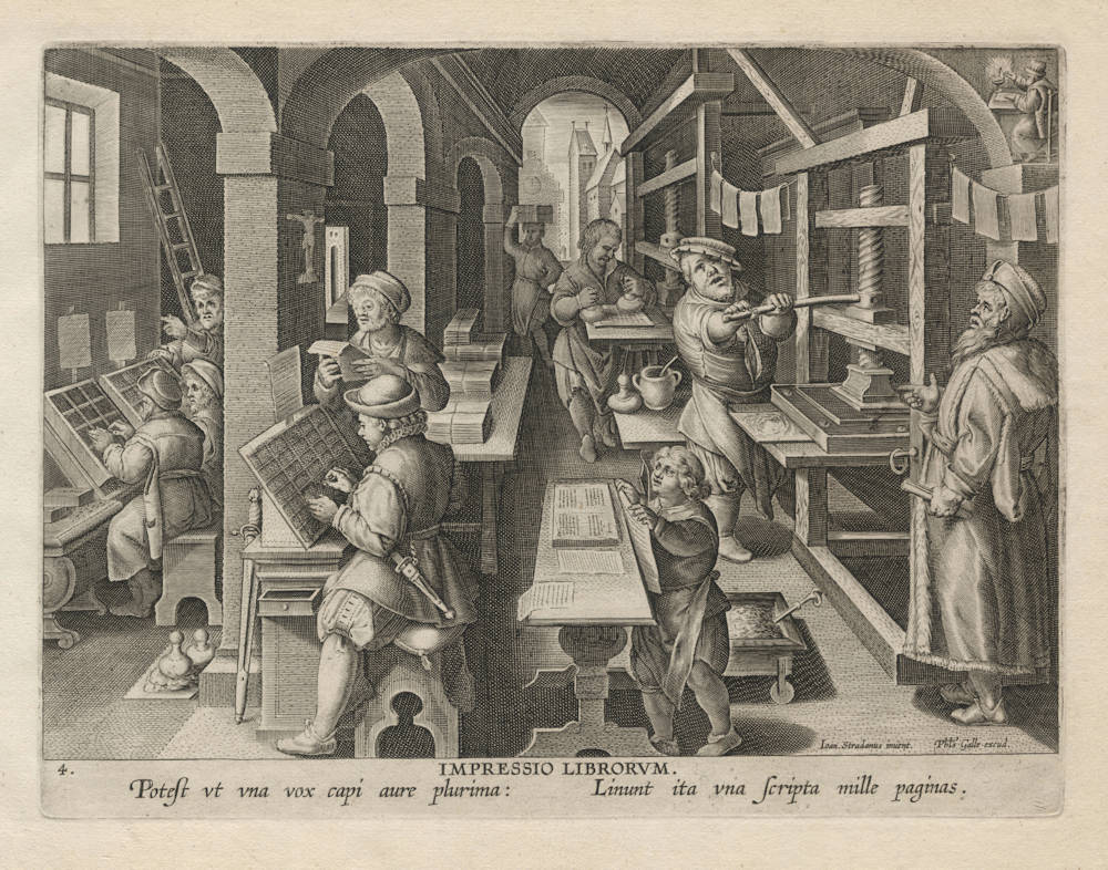 Stradanus' invention of book printing is iconic and of utmost significance.