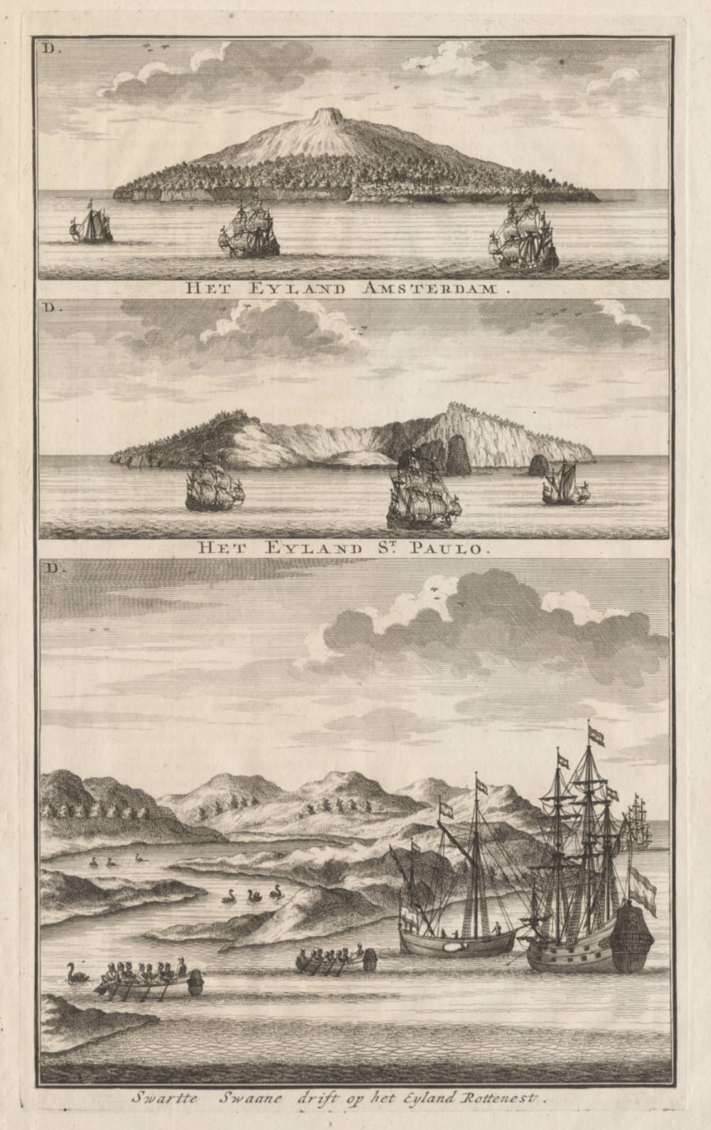 The first printed view of Australia. On one copperplate with two other views of the islands Amsterdam and St Paul, two tiny volcanic islands in the southern Indian Ocean. De Vlaming was the first to succeed to land on these islands, which were considered very high risk for navigation and for landing.