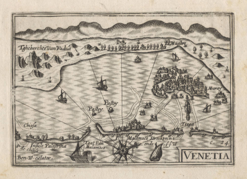 Unobtainable map/chart of Venice, engraved ca 1599 by Benjamin Wright for Amsterdam publisher Cornelis Claesz, but not published at that time. This map only occurs in Claes Janszoon Visscher's exceptionally rare Tabularum Geographicarum Contractarum of 1649. It is the first time we see this map appear in the market.
