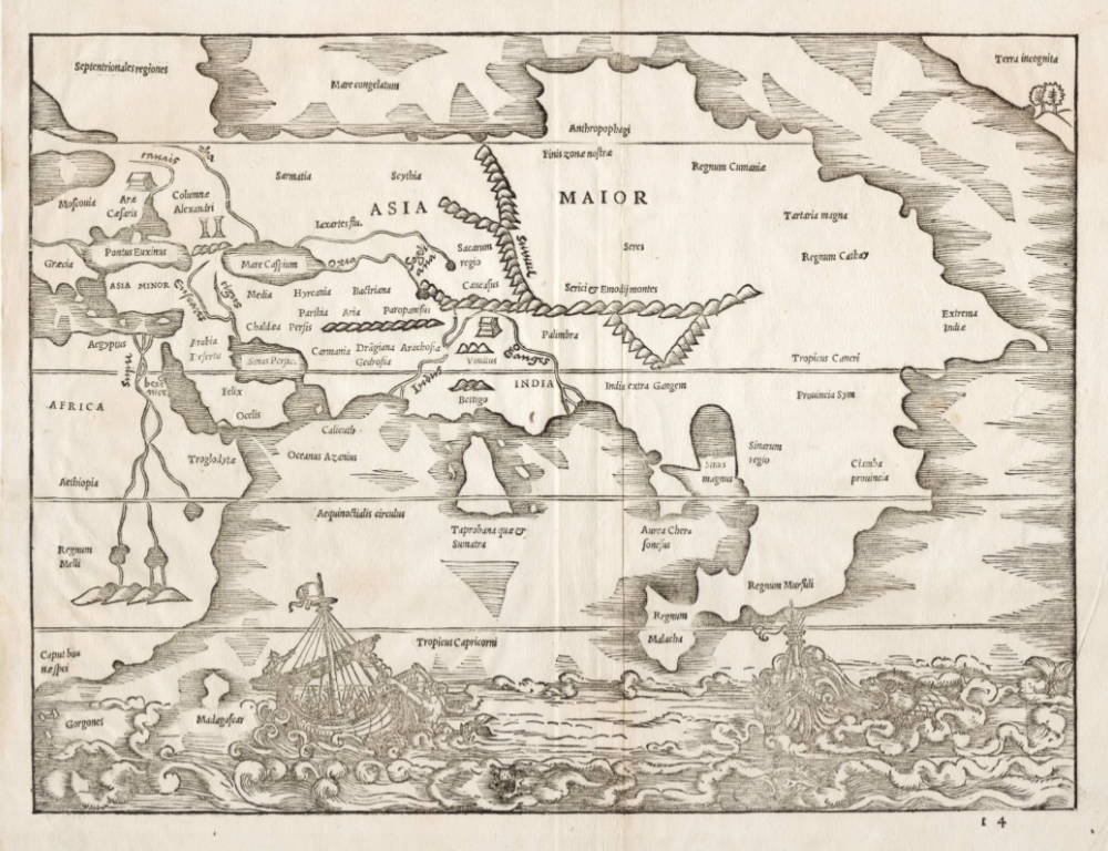 It is Sebastian Münster's earliest map of Asia, predating his Asia map of 1540. The Münster-Solinus map is of utmost relevance to the mapping of Asia, the Indian Ocean, the Pacific Ocean and Northwest America. The map is famous for the dramatic woodcut decorations of ships being attacked by sea monsters and mermaids.