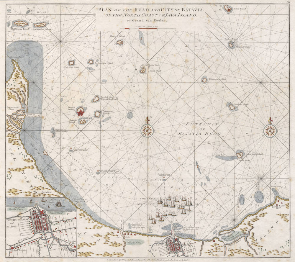 The prototype for this large VOC chart of Batavia roads was first issued by Gerard van Keulen in 1728 for Volume V of the Zeefakkel (Sea Torch). From 1753 onwards it was included in Volume VI, the secret atlas of the VOC.