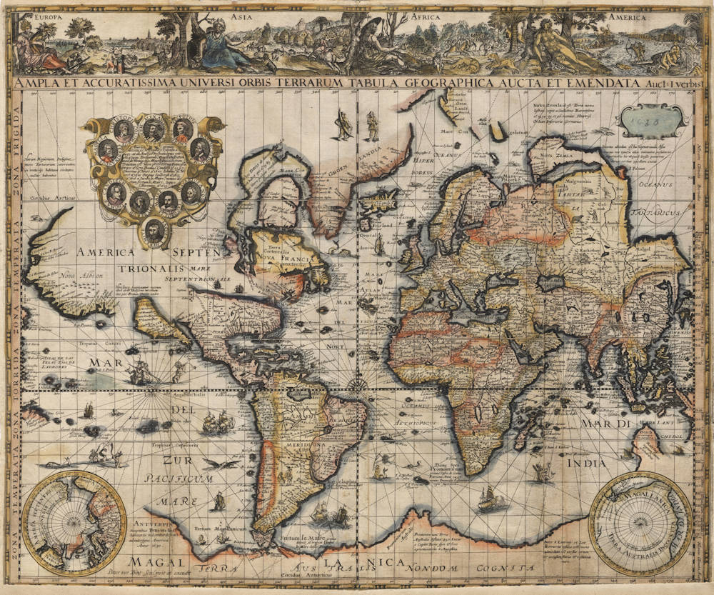 Iconic map of the world on Mercator's projection, decorated with the allegories of the four continents. It is one of the first maps to show the 1623 discoveries of the Pera and the Arnhem in the Gulf of Carpentaria.