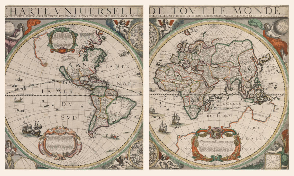 UNIVERSAL CHART OF THE WHOLE WORLD, IN WHICH MANY REGIONS ARE MORE ACCURATELY REPRESENTED THAN BEFORE & THE NEWLY DISCOVERED LANDS HAVE BEEN FAITHFULLY CORRECTED USING THE LATEST ACCOUNTS OF THE ENGLISH, THE DUTCH AND OTHERS. BY CORNELIS DANCKERTZ AND MELCHIOR TAVERNIER.