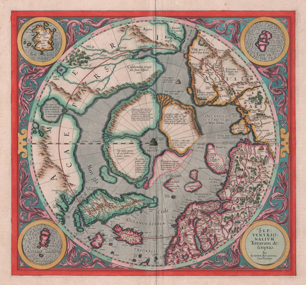 The author of this map, Gerard Mercator, died in December 1594; it was left to his son Rumold to publish it in the last of the three parts that formed his father's famous atlas, the Atlantis Pars Altera. This is the first map devoted to the Arctic, a hemispherical one on a North Polar projection with an attractive floral design surrounding it. In the corners are four roundels, one of these contains the title, the other three contain maps of the Faeroe Isles, the Shetland Isles and the mythical island of Frisland. The map is largely derived from the inset of the same area on his great world map of 1569. Here, however, its scope is enlarged to the latitude of 60 degrees; this enabled him to depict the recent attempts at finding the North West and North East Passages. The results of Frobisher's and Davis' attempts are recorded, largely derived from Cornelis Claesz's map of the previous year, or possibly Mercator had seen an example of the Emery Molineux globe produced in London, 1592.