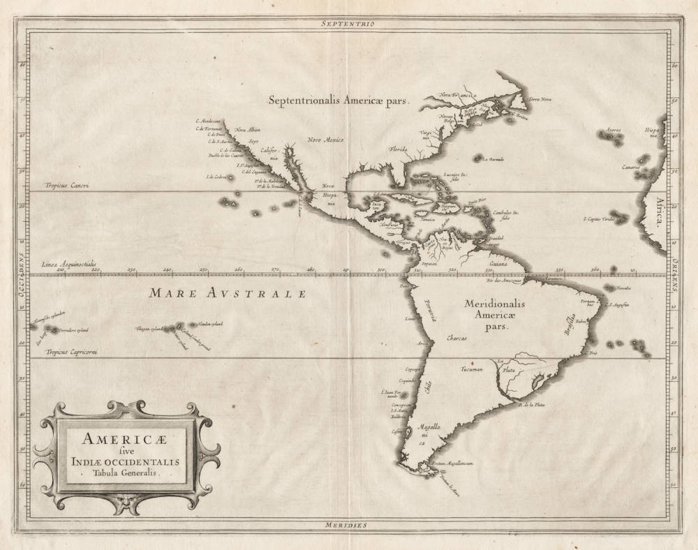 The map shows a good overview of the latest discoveries in the Americas and in the Pacific, including those of the Dutch East and West India Companies.