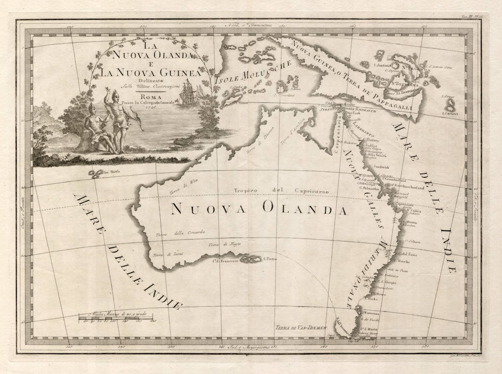 Following the much publicised, landmark discovery of Australia's east coast by Capt. James Cook in 1770, mapmakers around the world were quick to incorporate those discoveries onto their maps. Ironically, only a small handful of rare maps from that lot, concentrate on the whole Australian continent itself. Cassini's highly decorative map of Australia, is only the third such map (following the very scarce 1779 pocket atlas map by de Baillou, and Eden's rare 1787 map). It charts the discoveries made by Cook on the east coast of Australia, and labels many of them in Italian. The map features at the top left, a decorative vignette with natives and a ship. Australia is named Nuova Olanda and New Guinea is named Nuova Guinea, O Terra de Pappagalli - land of parrots. The Indian Ocean (Mare delle Indie) is shown to be on both sides of Australia.