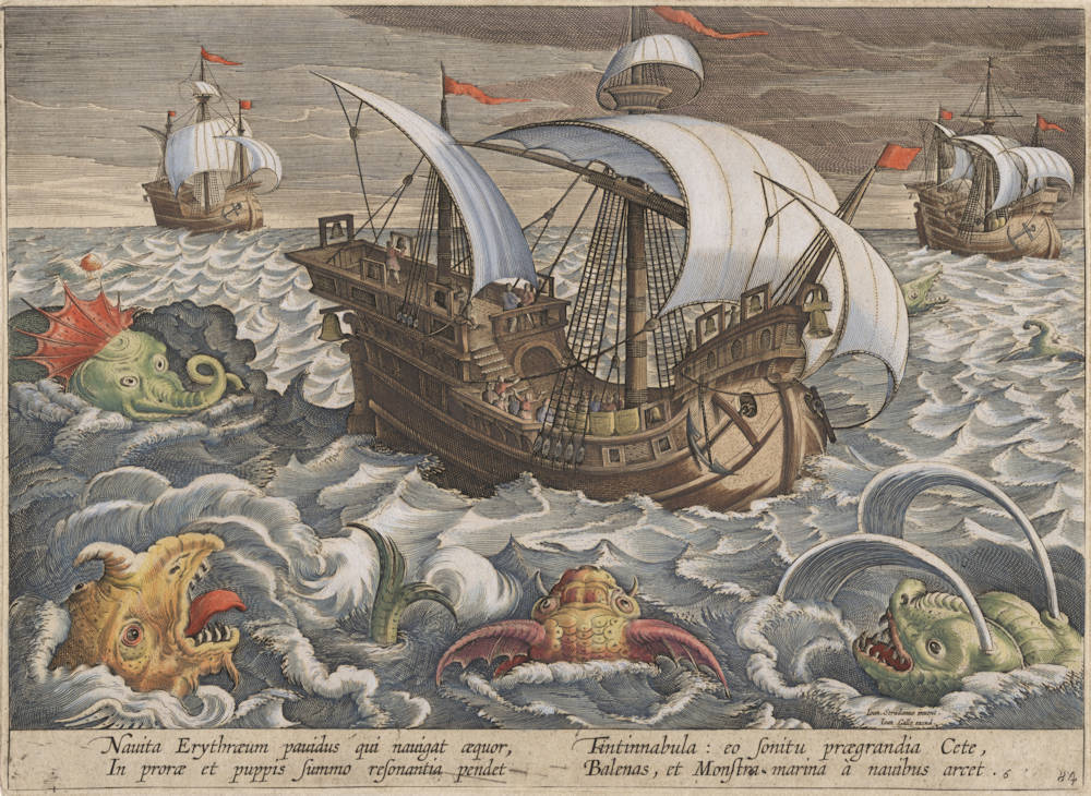 Legendary and iconic engraving by Philip Galle after a drawing by Jan van der Straet (ca. 1575), showing the animals and the dangers of the Indian Ocean.