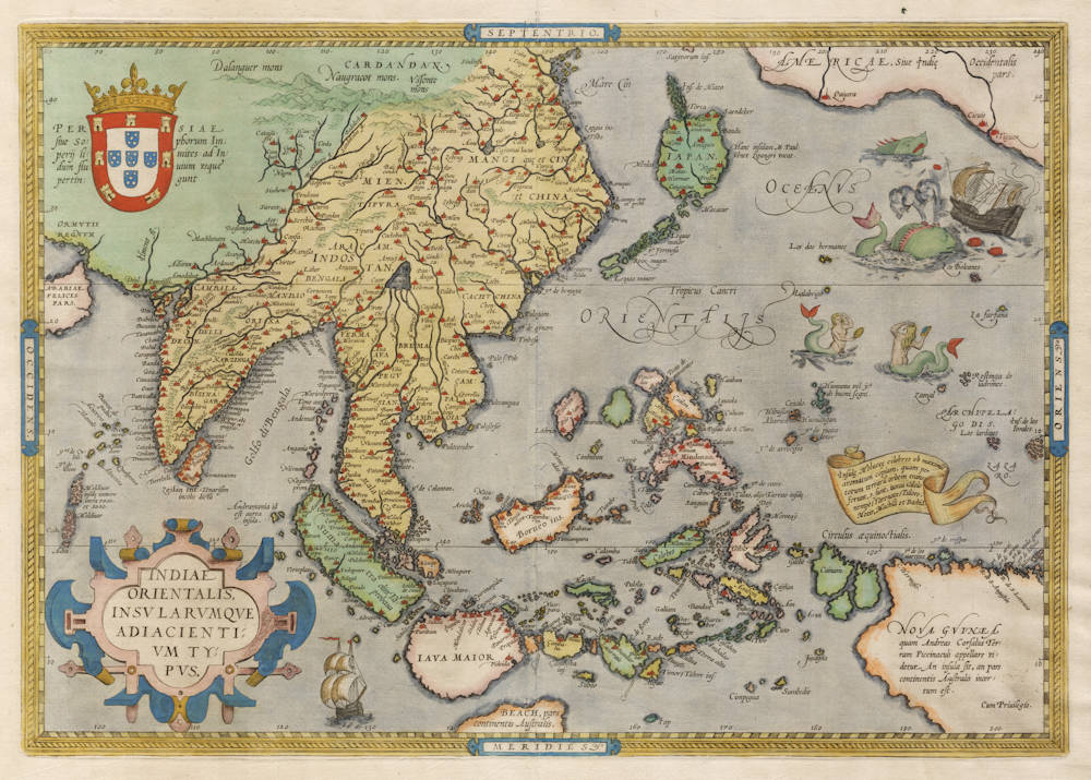 One of the most splendid maps of Ortelius, this map has everything that makes sixteenth century maps so attractive. Lovely mermaids, gruesome sea monsters and shipwrecks included. The cartography is distorted. Many elements of Marco Polo have been used, as well as the latest discoveries. Japan has the typical kite shape introduced by Mercator. The Portuguese coat of arms is shown prominently to underline that this is "Portuguese India".