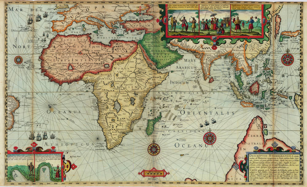 The map shows the area between the easternmost point of Brazil in the west and the western point of New Guinea in the east. In the north, the map image reaches from Emden in Europe and Korea in Asia to the protuberance of a large TERRA AUSTRALIS INCOGNITA in the south. Contemporary material was used as source for the representations; this consisted mainly of maps that had recently been published by Cornelis Claesz. For instance, the coasts, islands, and shallows in the Indian Ocean were copied from the maps in Van Linschoten’s Itinerario (1596), while most of the Indonesian archipelago and the Philippines corresponds in terms of drawing and toponyms to Plancius's map of the Moluccan Spice Islands (1592). For the depiction of Korea and Japan, which were no longer included on Plancius's map, the model was Luis Teixeira's map of this area found in Ortelius's Theatrum Orbis Terrarum (1595). Plancius's hypothetical coastline of South Java has been left out. It is striking that not a single Dutch name appears anywhere on the map. Nor are there any names that are derived directly from De Houtman's voyage.