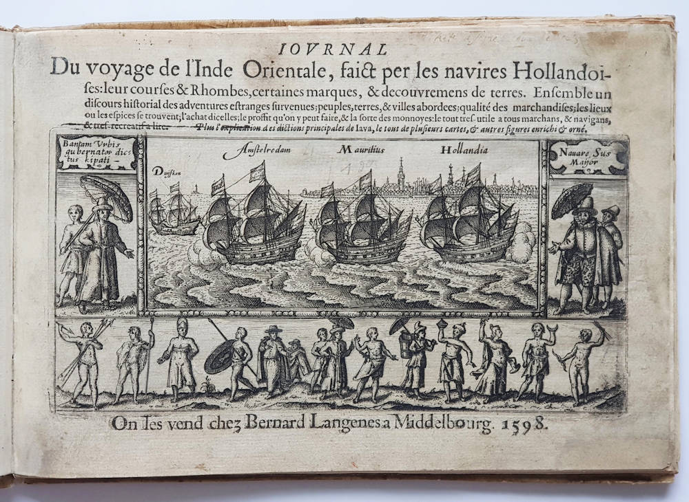 Already in 1597, shortly after the return of the first fleet, the Middelburg publisher Barent Langenes published an acclaimed account of the first voyage, predating the Lodewijcksz account published by Cornelis Claesz in Amsterdam. The journal was immediately translated by John Wolfe who issued the English version a few months later. The journal’s title page shows the fleet setting sail from Amsterdam roadstead.