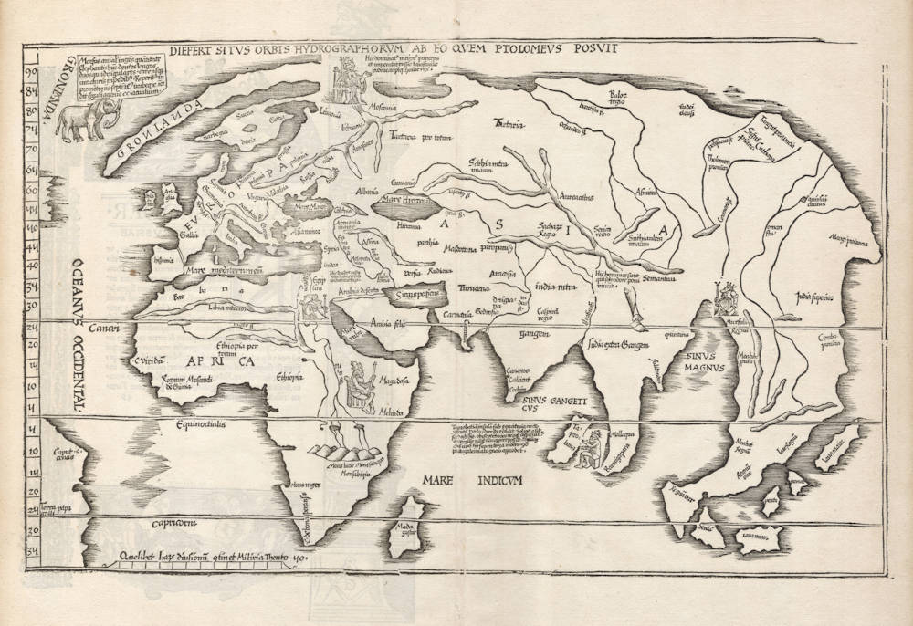 The geography of Fries' world map follows Waldseemüller's 1513 atlas map of the world, but Fries has added a few images and text legends that come from Waldseemüller's newer 1516 wall map of the world that had been published in the meantime.