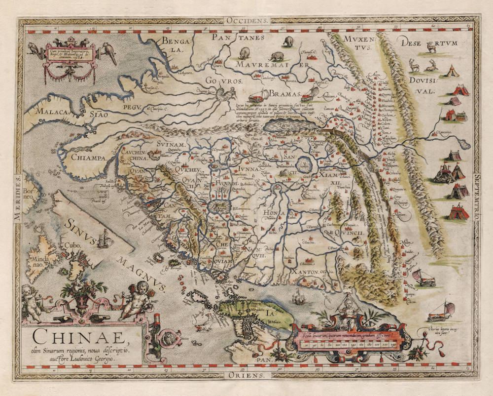 A seminal map of China published by Ortelius from 1584 onwards. The map had been compiled by Luiz Jorge de Barbuda, a Portuguese Jesuit missionary. West is at the top of the map. Three decorative cartouches. Pictures of Tartarian wagon-dwellers, sailing wagons, elephants and reindeer fill the unknown areas north and east of China.