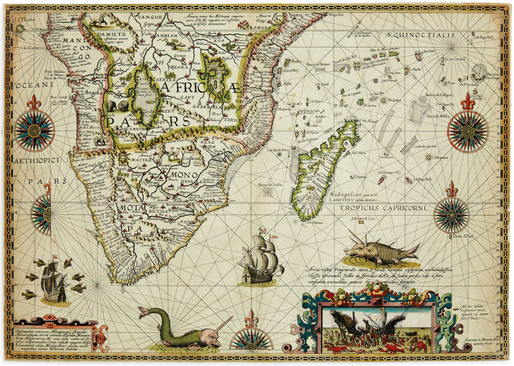 The map was designed by Petrus Plancius, engraved by Johannes van Doetecum and sold as a separate chart by Cornelis Claesz’ publishing house. It is richly decorated with compass roses, ships and sea monsters, as well as an inset depicting the loss of the Portuguese admiral ship Santiago, which was one of the most tragic and deadly shipwrecks of the 16th century.