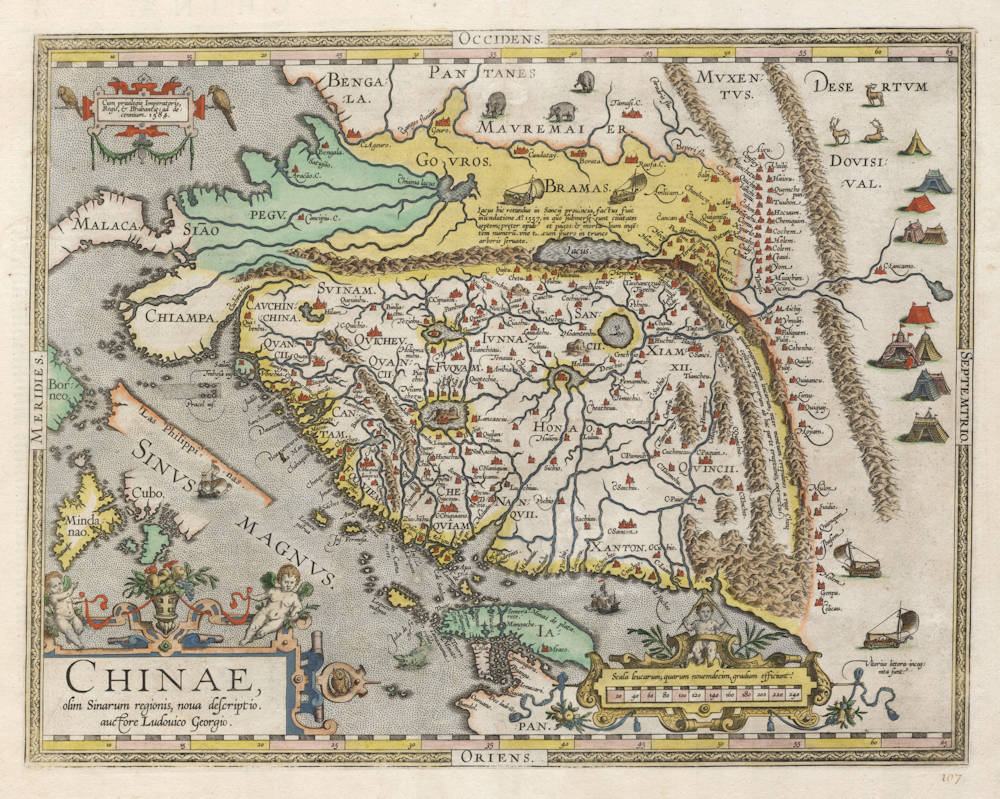 A seminal map of China published by Ortelius from 1584 onwards. The map had been compiled by Luiz Jorge de Barbuda, a Portuguese Jesuit missionary. West is at the top of the map. Three decorative cartouches. Pictures of Tartarian wagon-dwellers, sailing wagons, elephants and reindeer fill the unknown areas north and east of China.