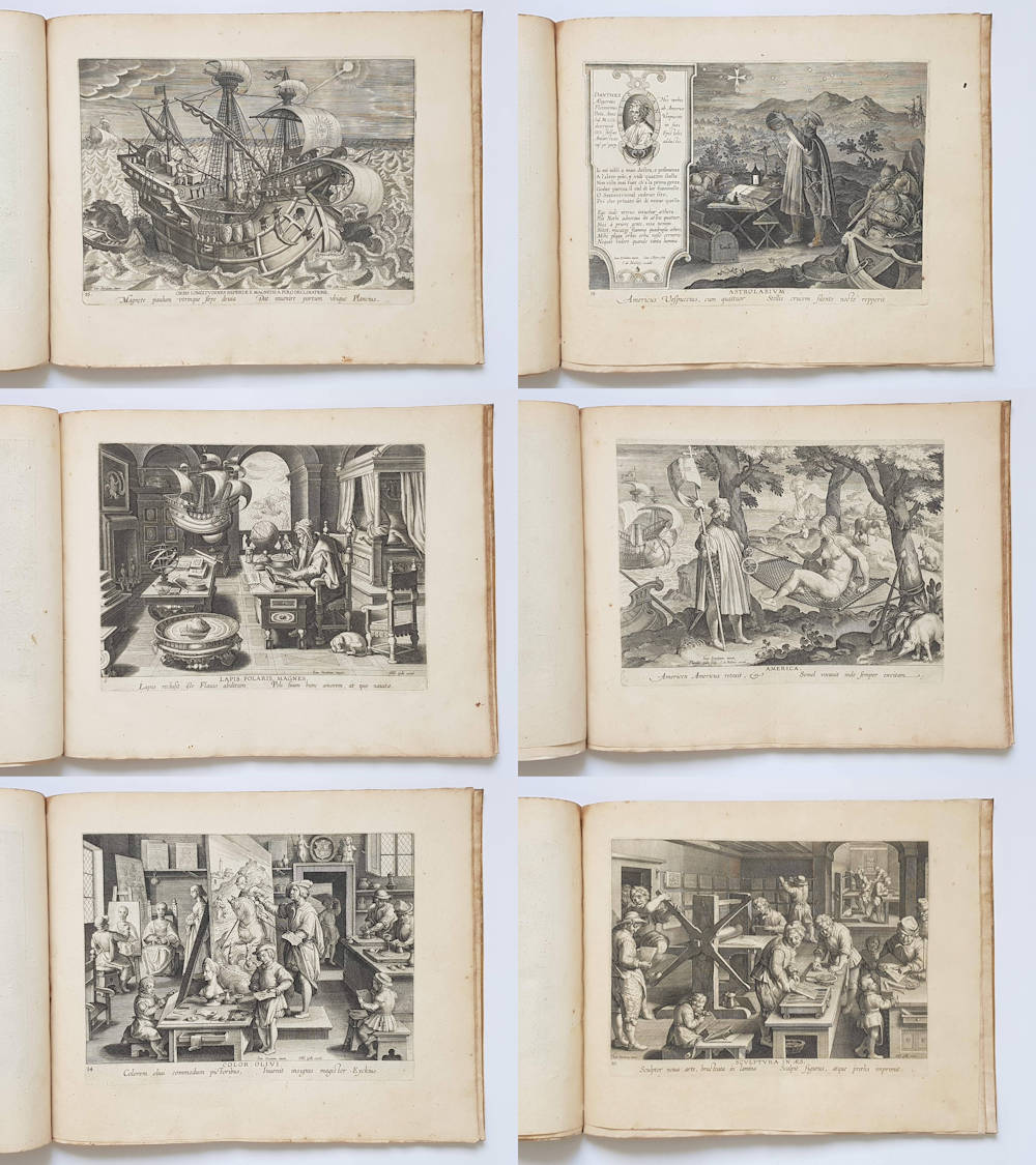 The title page is illustrated with small pictures of the inventions and discoveries which are depicted in more detail in the first ten plates. The last nine plates may have been an afterthought, as they are not included on the title-page. The plates depict: Vespucci's discovery of America, an observatory, a gun-foundry, a printing press, a clock-maker's, medical care, a distillery, silk-manufacture, a farrier's, a water-mill, wind-mills, an oil-press, a sugar-factory, a painter's studio, an optician's, ship-navigation, an armory, an astrolabe demonstrated by Amerigo Vespucci, and a copperplate engraver's.