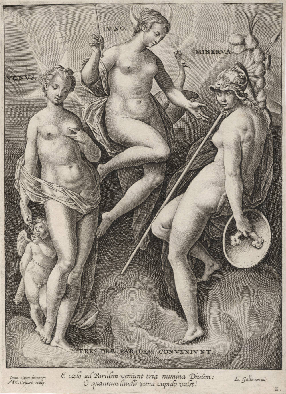 New Hollstein Dutch 289. Here in a later state with the address of Ioan Galle, and the names of Venus, Iuno and Minerva added to the print, as well as a subtitle underneath the goddesses. TIn good condition. Tear restored in the upper right corner, nearly visible. Very good dark/grey impression of this rare engraving printed on thin laid paper with 2 mm margins. Excellent quality.