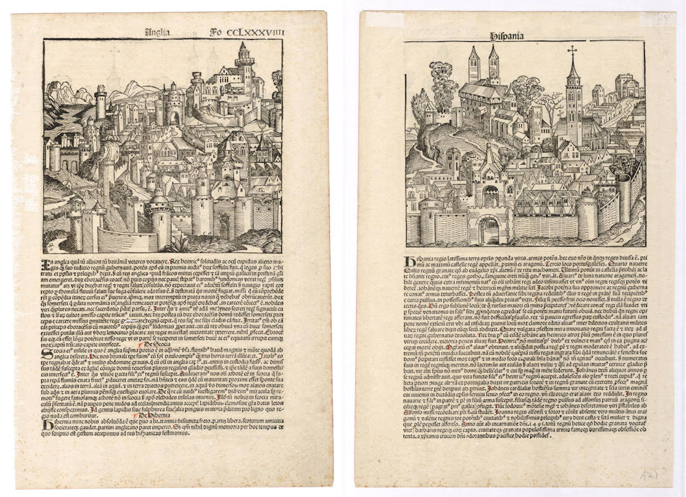 Very early woodcut by Hartmann Schedel to focus on England and Spain in the form of a medieval town. This is one sheet, with England on one side, and Spain on the other. The text on the England sheet has three paragraphs, on England, Scotland and Ireland.