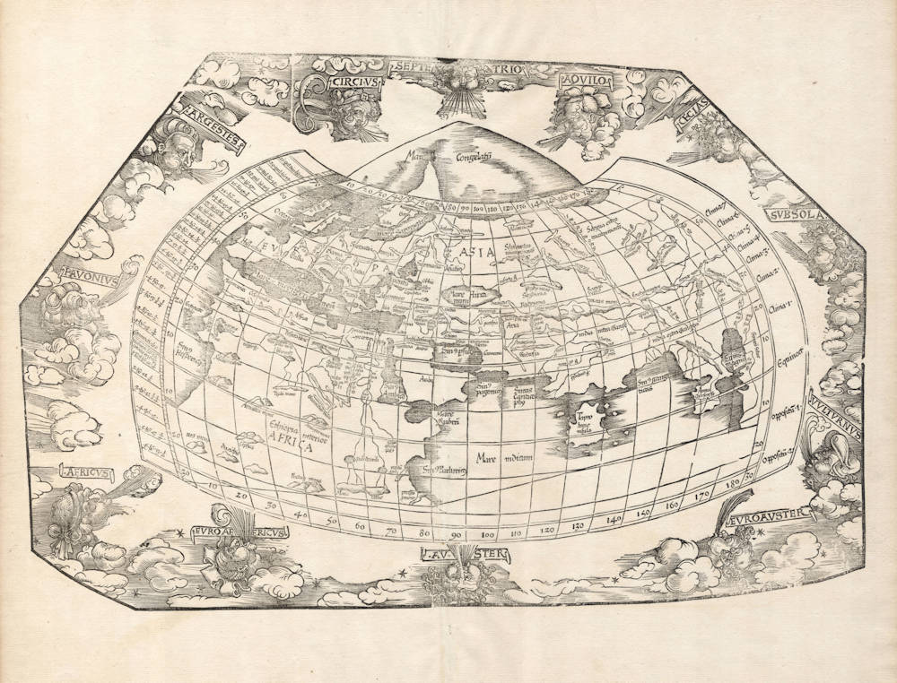 Fries' map is a reduced copy of Waldseemüller's 1513 Ptolemy map of the world. Somewhat surprisingly, and unrecorded in the literature, Waldseemüller had erroneously reversed the eastern and western winds from classical antiquity. Fries took over that mistake in his first 1522 edition of the map, but corrected it when adding the decorated border with the heads of the winds in the 1525 edition. It is also noteworthy that where Waldseemüller uses Ptolemy's canonical projection, which is relatively simple to draw, Fries has chosen Ptolemy's second "cloak" (chlamys) projection, which provides a far more satisfactory image of the earth's shape, but is also much harder to contruct, because both the lines of latitude as well as the lines of longitude are curved.