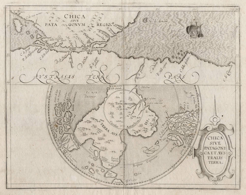 The upper part of the copperplate shows a second map, on plane degrees, zooming in on Patagonia and the Strait of Magellan, between South America and today's Tierra del Fuego, which was the only part of the Southland that was considered to have been seen by the three first circumnavigators (Magellan, Drake, Cavendish). Magellan's ship Victoria is shown on the right sailing towards the Strait.