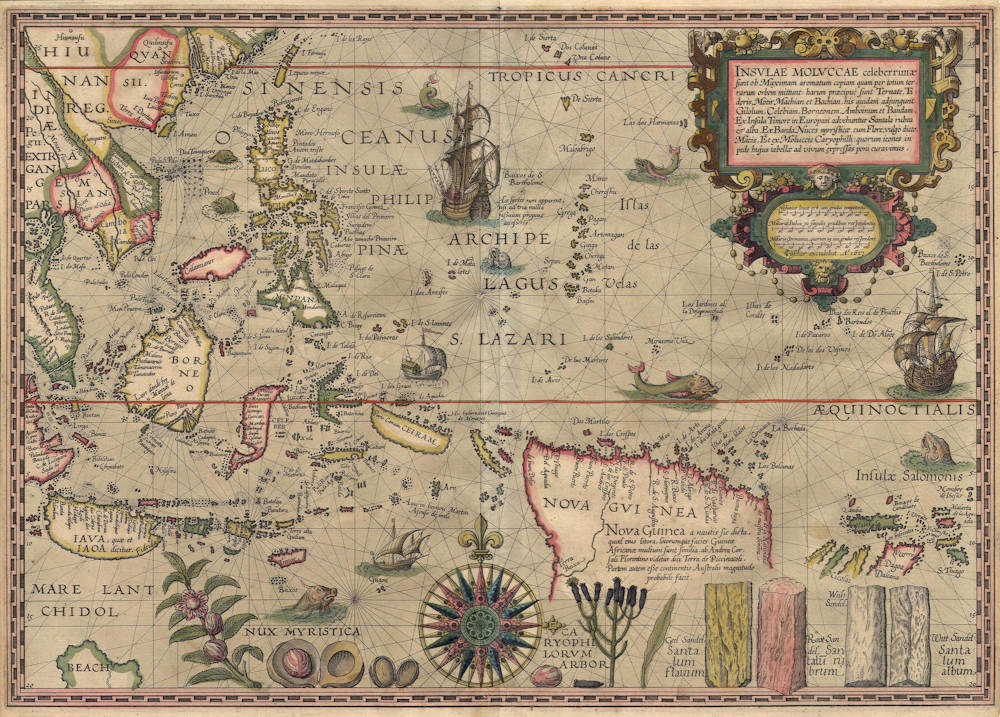 As noted in the title, running along the lower edge of the map are drawings of the most coveted products of the Moluccas:
