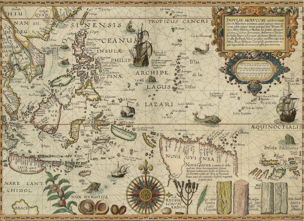 As noted in the title, running along the lower edge of the map are drawings of the most coveted products of the Moluccas: