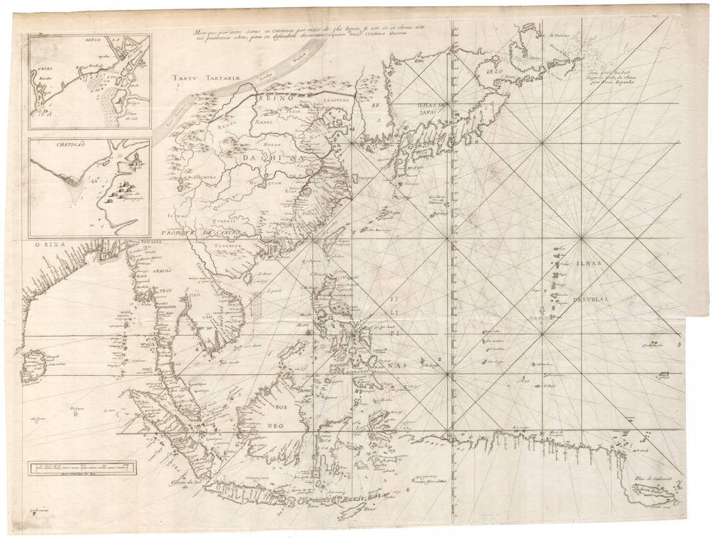 This sea chart covers the whole area from Ceylon to Japan, including Indonesia, the northern coast of New Guinea, Indochina, Taiwan, the Philippines, China and Japan. The lattitudes cover all the way from 50 degrees North to 10 degrees South. A scalebar is in the southwest, in Portuguese Leguas, with privilege to the King. The Portuguese nomenclature and toponyms have been faithfully copied from the original chart.
