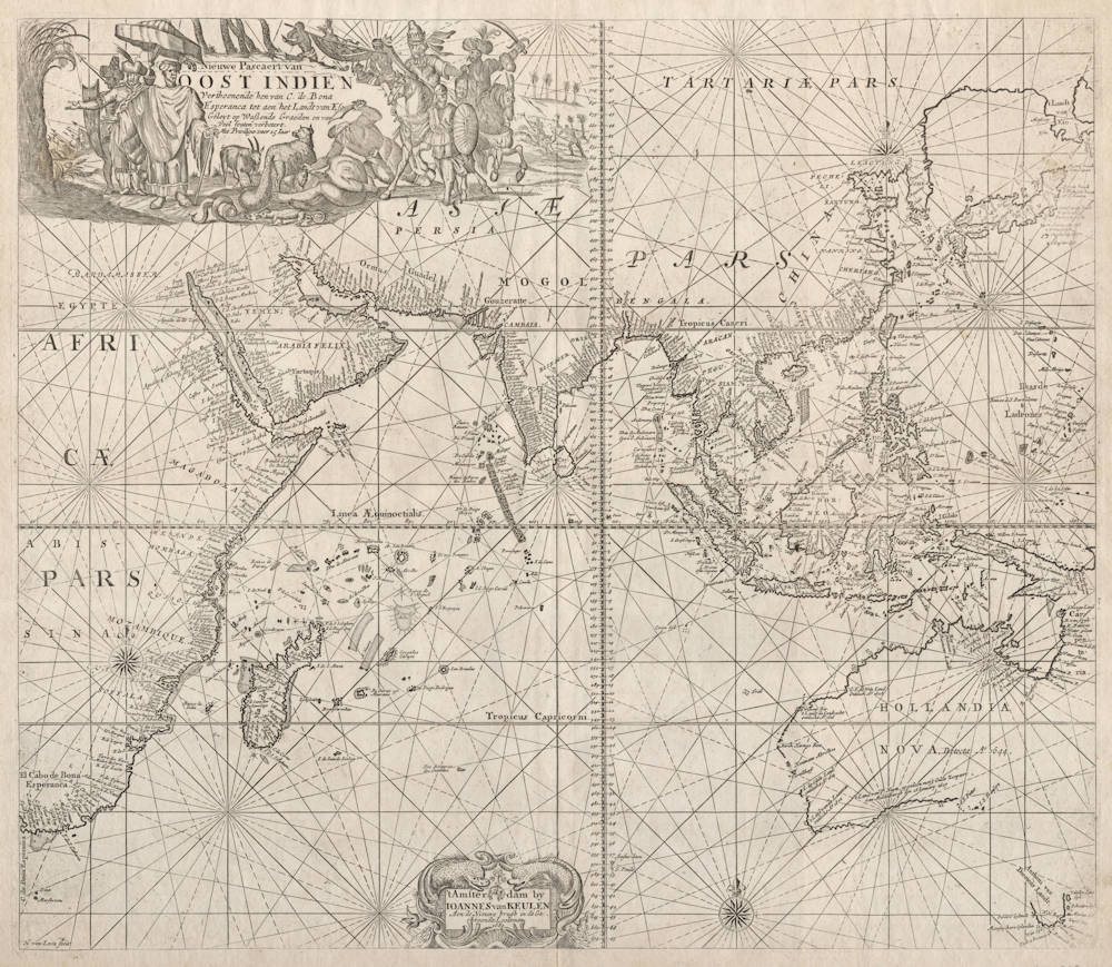 This is one of the most desirable navigation charts of the East Indies and Australia, published by Johannes van Keulen in Amsterdam. The map stretches from Cape of Good Hope to Japan, and from the Red Sea to Tasmania. Two decorative cartouches, the large one showing the splendour and richness of the East. Decorated with many ships, rhumb lines, compass roses. It covers all of the waters of the monopoly charter of the Dutch East India company, all the way from the Cape of Good Hope to Japan. It covers all of the Indian Ocean, as well as the waters from Batavia to Japan.