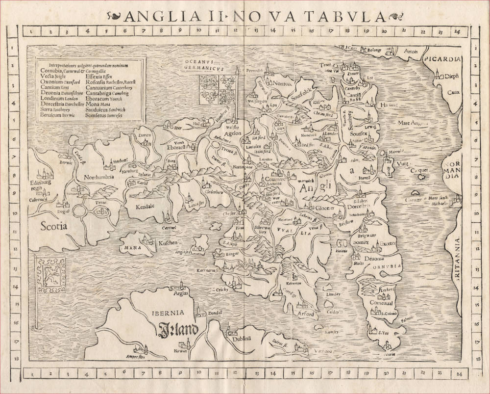 This is a new map, substantially in advance of any others printed hitherto. It is oriented so that east is at the top and shows all of England and Wales, southern Scotland and the eastern portion of Ireland.