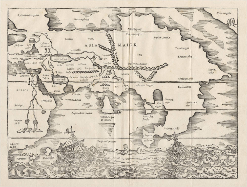 It is Sebastian Münster's earliest map of Asia, predating his Asia map of 1540. The Münster-Solinus map is of utmost relevance to the mapping of Asia, the Indian Ocean, the Pacific Ocean and Northwest America. The map is famous for the dramatic woodcut decorations of ships being attacked by sea monsters and mermaids.