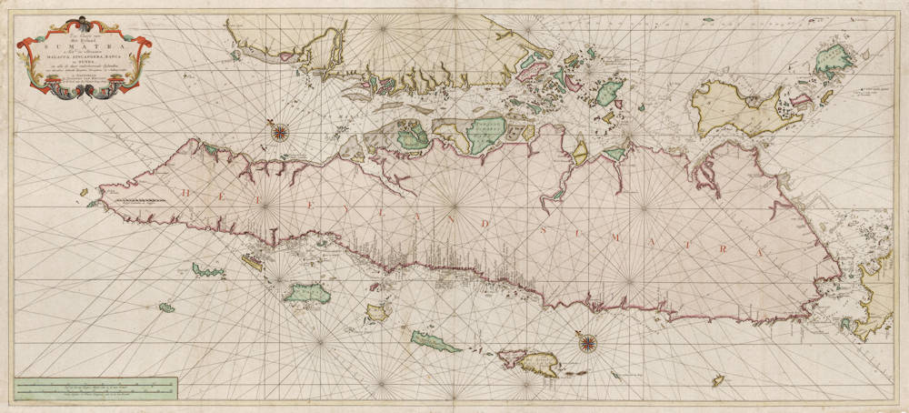 Majectic double page sea chart covering Sumatra, Singapore, parts of modern day Malaysia, and the western part of Java. A seminal map, and one of the first accurate charts of these waters.