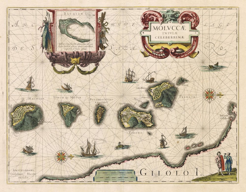 Ever since the first Portuguese expedition under Albuquerque from Malacca in 1511, the Spice Islands, or Moluccas, had been the great prize to Europeans in the East. Great attention was therefore paid by navigators and mapmakers to the accurate depiction of the islands and routes to them, both from Europe as well as from other European strongholds in the East. The early Portuguese navigators soon found that the most important of the Spice Islands were Ternate, Tidore (Tidoro on Willem Blaeu's map), and Halmahera (part of which is shown along the bottom of this map by a rendering of its native name as Gilolo) for cloves, and Amboina and the Banda Islands for nutmeg and mace.