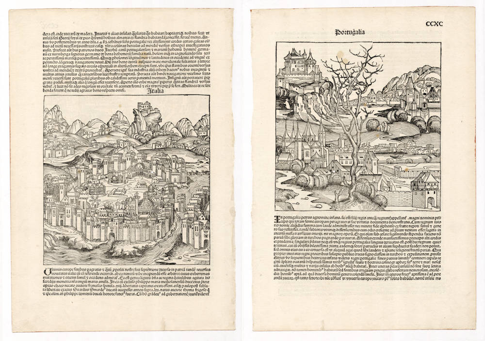 Very early woodcut by Hartmann Schedel to focus on Italy and Portugal in the form of a medieval town. This is one sheet, with Italy on one side, and Portugal on the other.